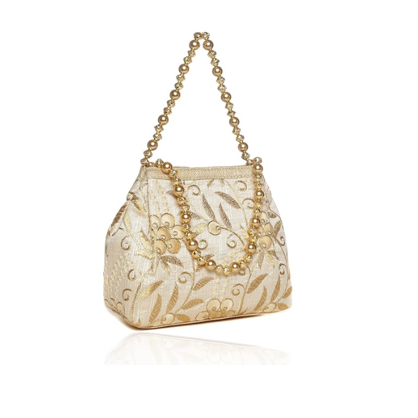 Made from premium raw silk, this potli bag features detailed golden embroidery that beautifully complements ethnic outfits like sarees, lehengas, or anarkalis. The highlight is its luxurious golden pearl handle with delicate tassels, adding a hint of vintage glamour and making it easy to carry gracefully in hand or on the wrist.